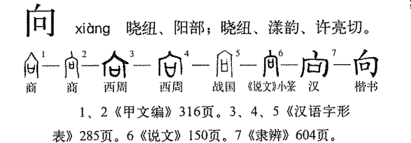 向 甲骨文字形 “向”的甲骨文字形 “向”字典中的甲骨文字形 “向”龟甲兽骨上的形态 “向”《字源》中的字形演变 字理阐发 甲骨文字形从宀,表示房屋;从口,表示向北的窗口。 字理教学 会意字,可结合甲骨字形进行分析,此处可以补充中国古代建筑文化相关知识。 字与文化 “向”或作“嚮”“鄉”。《说文·宀部》:“向,北出牖也。”其字是北窗的象形,用作上古宫室外壁北窗的专称。《诗·豳风·七月》:“塞向墐户。”毛传:“向,北出牖也。”“户”,此指内室之北壁小门,“墐”亦塞义。意谓将北面的门窗用泥巴堵塞以防寒。湖北黄陂盘龙城商代宫殿遗址,其四室门皆南向,即是“牖”;两侧二小室有后窗,即是“向”。江苏邳州大墩子遗址出土商代陶屋模型也有北出之“向”。“向”在上古有时也可作窗的泛称。《礼记·名堂位》:“复庙重檐,刮楹达鄉。”窗牖通气,故称“达鄉”,即“达向”。孔颖达疏:“达,通也;鄉,牖也。每室四户八窗,窗户皆相对,以牖户通达,故曰达鄉也。”上举《荀子·君道》之“门户牖嚮”“嚮也是窗的泛称。“向”之本义主要用于上古。